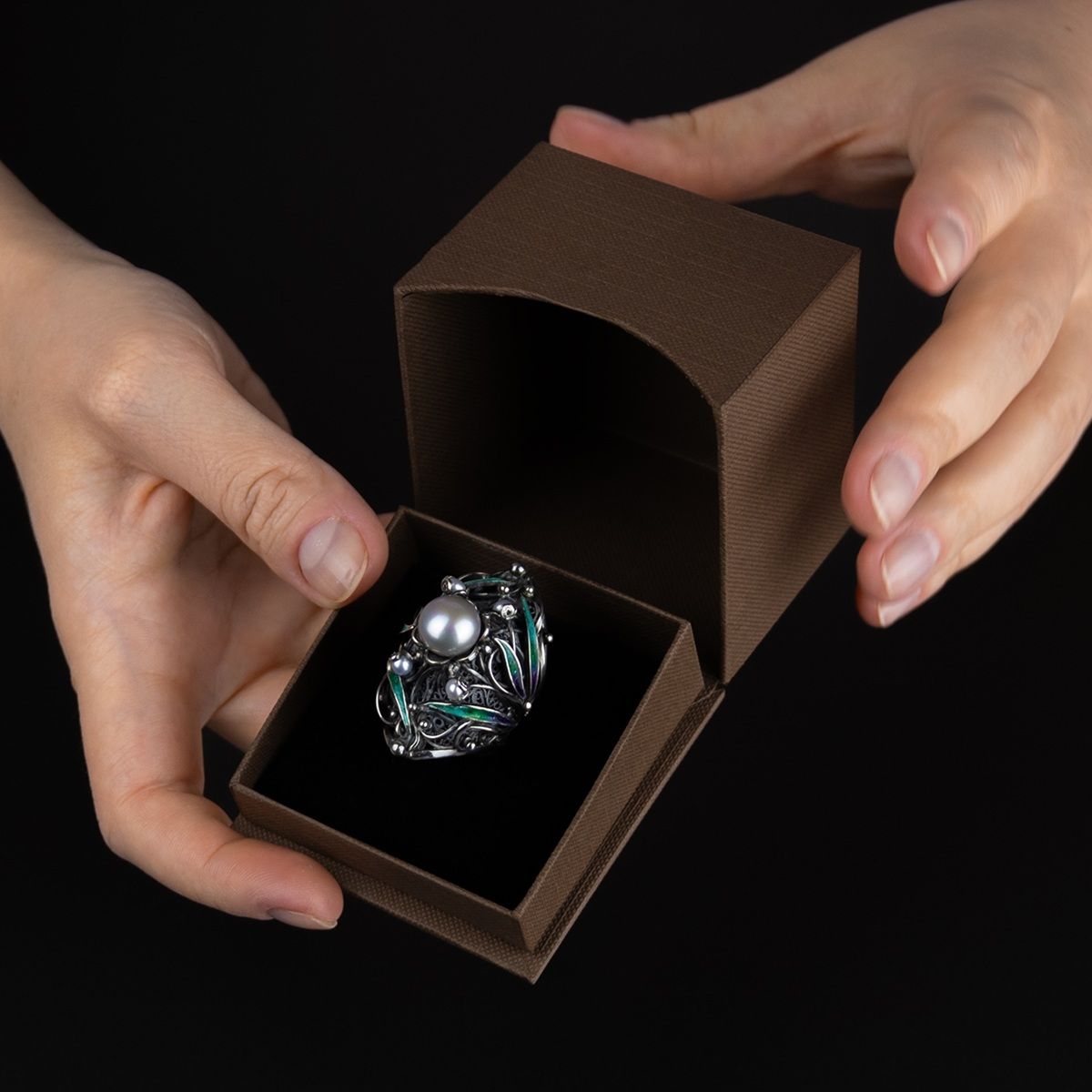 Представляем авторские ювелирные украшения DARIA.JW, в которых сочетание совершенно разных техник, например, филиграни и горячей эмали, придаёт роскошь и неповторимую красоту каждому изделию. Кольцо Берегиня выполнено из чернёного серебра 925 пробы с покрытием горячей эмалью и декорировано натуральным жемчугом редкого серого оттенка. Эксклюзивно для Nasonpearl.