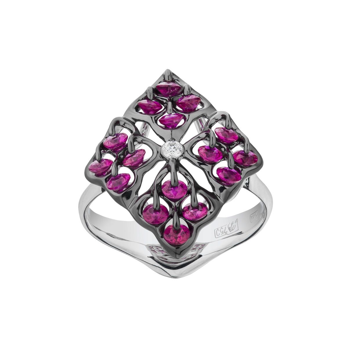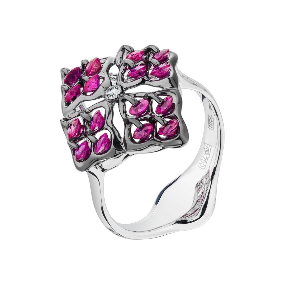 Акцентное кольцо Прима, выполненное из белого золота 750 пробы и инкрустированное красными рубинами и прозрачным бриллиантом, представлено нашим партнёром ювелирным домом MOISEIKINⓇ. Уникальность украшения заключается в технологии закрепки камня Waltzing Brilliance, которая не только соединяет части изделия, но и дает возможность раскрыть самые яркие стороны каждой детали, особенно камня. Металлическая оправа прочно закрепляет самоцвет, но при этом позволяет ему свободно «вальсировать», «порхать», раскрывать свою индивидуальность и характер. Эксклюзивно для Nasonpearl.