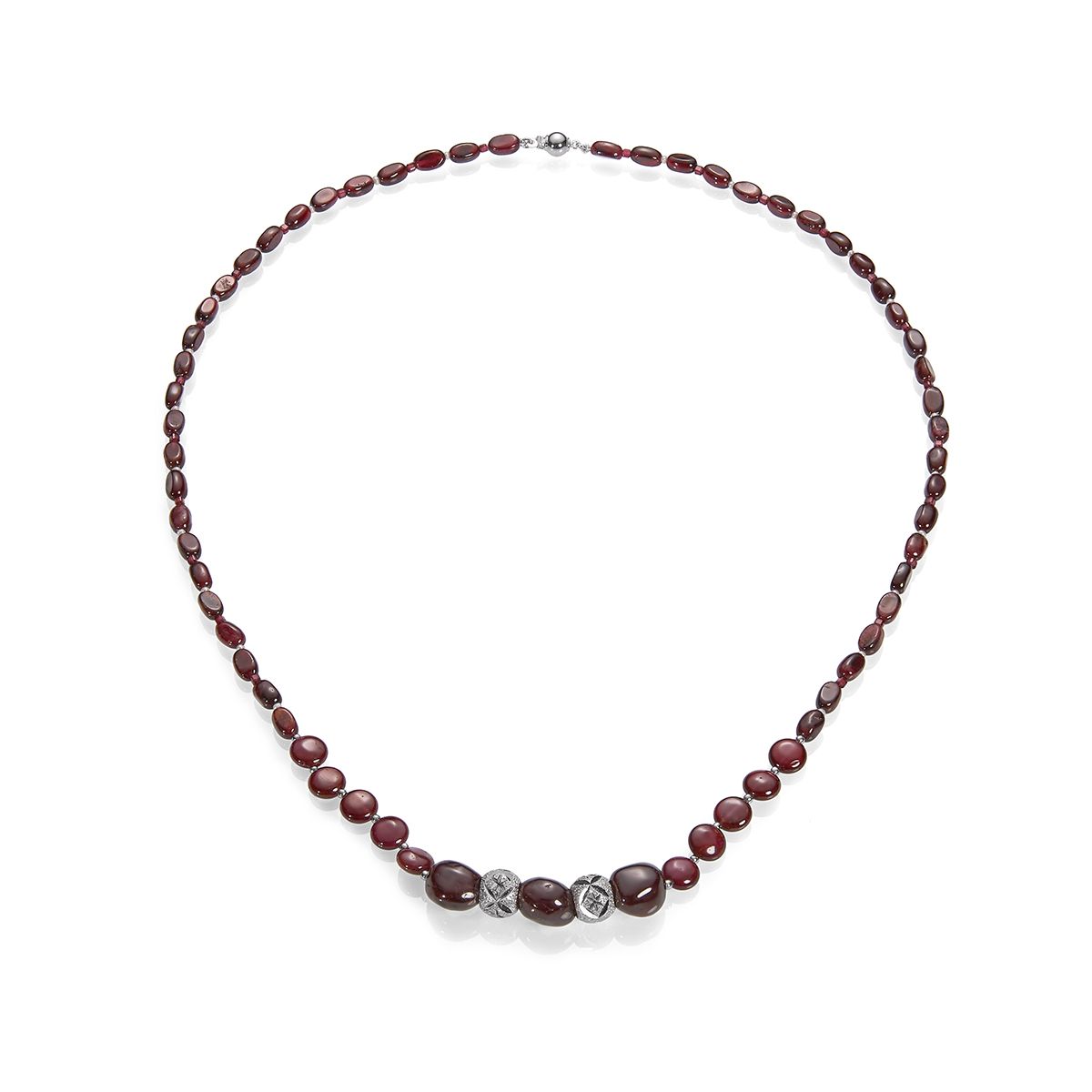 Ожерелье Бургунди от ювелирной марки Nasonpearl - выбор тех, кто не следует трендам, а задает их, кто в безупречной простоте видит высшую степень утонченности. Украшение искусно собрано из сочных натуральных гранатов насыщенного винного оттенка и мелкого белоснежного жемчуга. Игра контраста теплого глубокого цвета и холодного сияния создает удивительно гармоничный и притягательный образ.