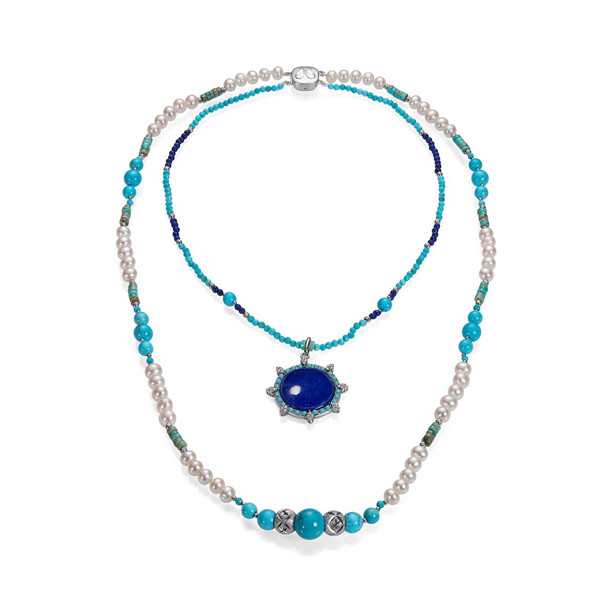 Яркое авторское ожерелье Морская волна от дизайнерского ателье Nasonpearl, где элегантность жемчуга встречается со смелой палитрой бирюзы и лазурита. Центром притяжения становится крупная подвеска в серебряной оправе. Каждый камень имеет естественные природные оттенки и текстуру, что делает украшение единственным в своем роде. Идеально для яркого повседневного образа, вечернего выхода или в качестве акцента на глубоком декольте.