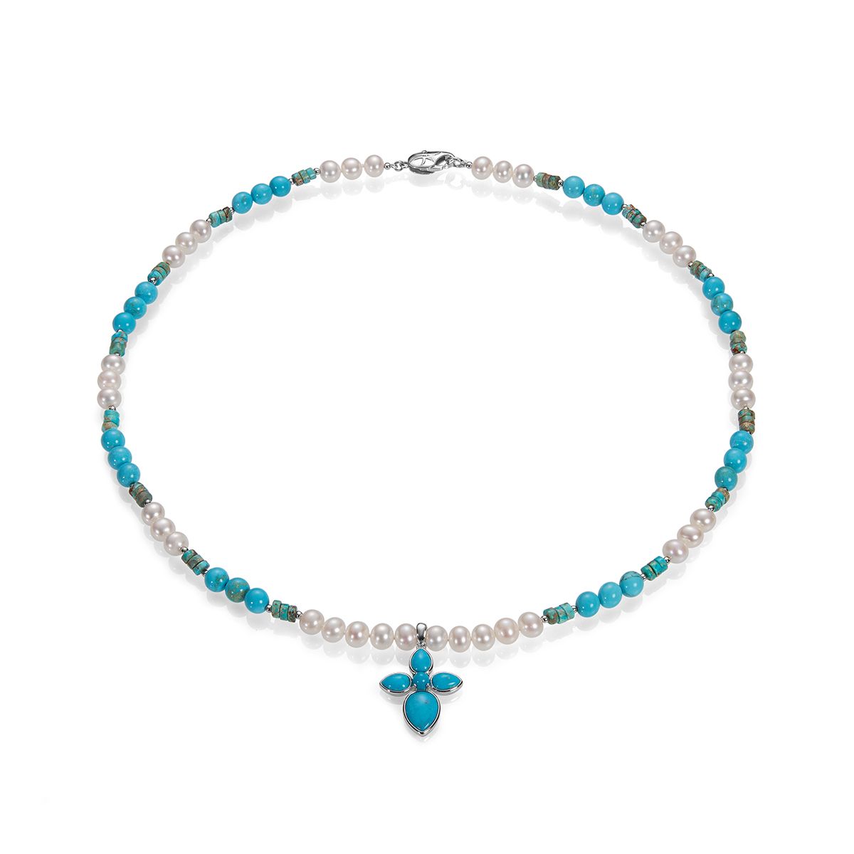 Авторское ожерелье Морская волна ручной работы от дизайнерского ателье Nasonpearl, где белоснежный пресноводный жемчуг встречается с яркой лазурью натуральной бирюзы. Центр композиции — изящный серебряный крест, инкрустированный бирюзой. Это симфония морских мотивов и глубокой символики, воплощенная в благородных материалах.
