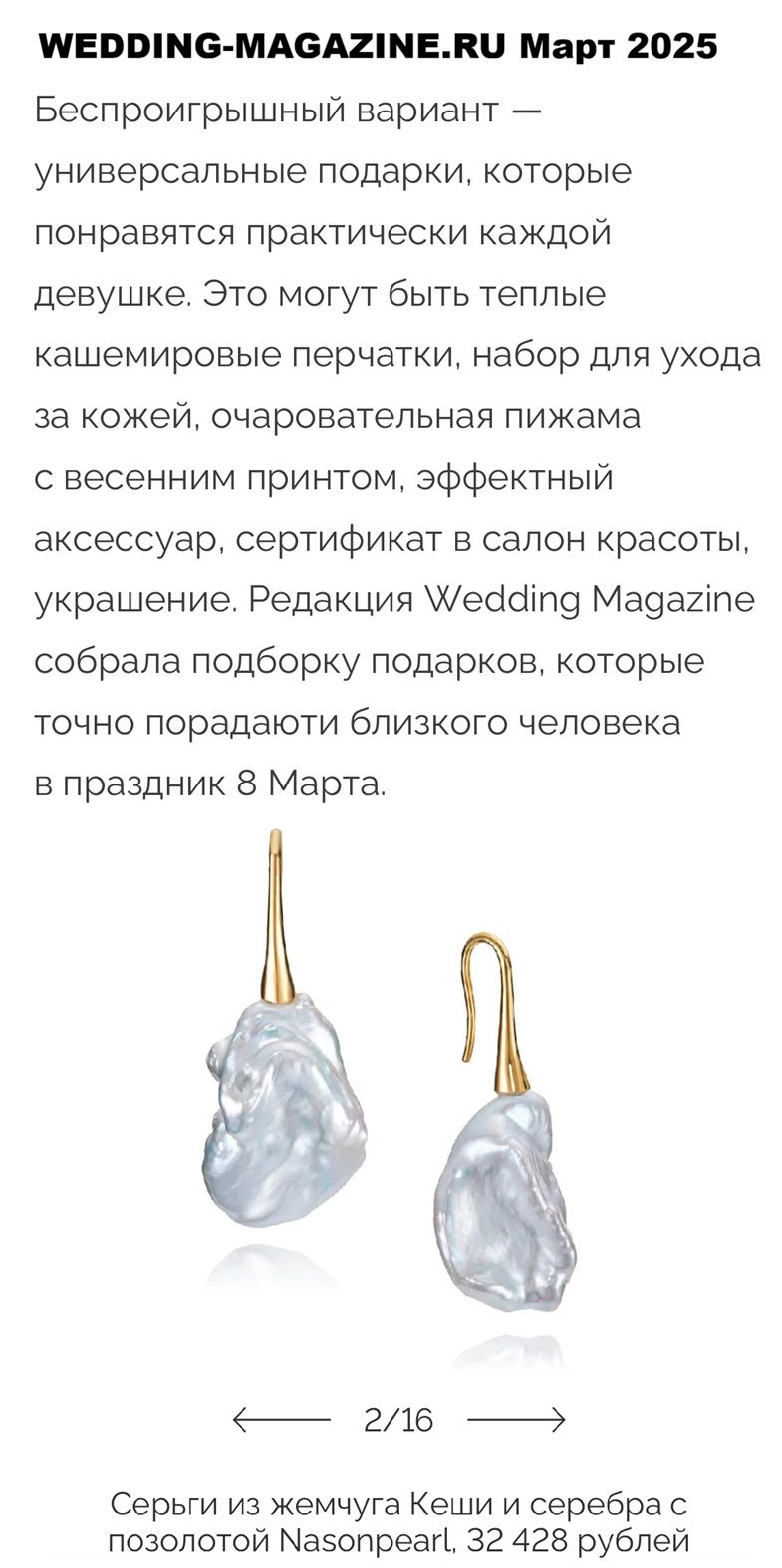 Серьги от ювелирной марки Nasonpearl выглядят изысканно и привлекательно. Сочетание позолоты и белого жемчуга создаёт элегантный контраст, делая серьги универсальным аксессуаром, который подойдет как для повседневного образа, так и для особых случаев. Жемчуг Кеши, известный своей неправильной природной формой, придает украшению уникальный характер.